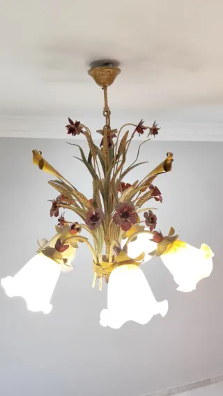 Elegante lámpara de estilo florentino con un diseño floral. - Estructura principal en metal dorado y marrón. - Detalles florales en tonos burdeos. - Tulipanes de cristal blanco para la iluminación.