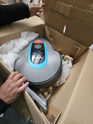 Robot cortacésped GARDENA para jardines pequeños. Incluye accesorios visibles en la caja. Ideal para mantenimiento automático del césped.