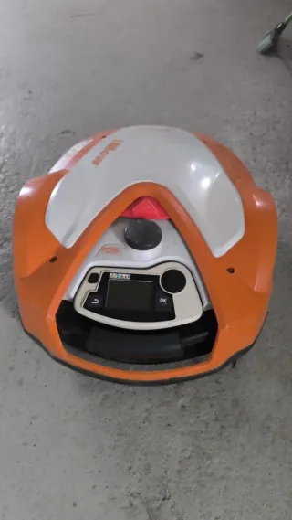 Robot cortacésped STIHL iMow de color naranja y blanco. Ruedas 4X4 Base de carga - Diseño moderno y compacto. - Pantalla LCD con botones de control.