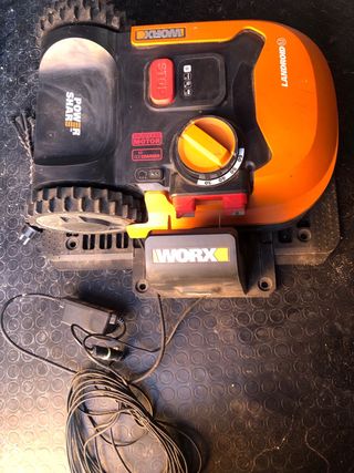 Robot cortacésped Worx Landroid WR165E, diseñado para jardines de hasta 500 m². - Color negro y naranja. - Incluye base de carga, piquetas y cableado. Herramienta para enterrar hilo GeoTech No se ha usado, solo instalado y vuelto a guardar. Garantía hasta el 27/11/2028