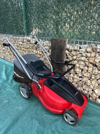 Cortacésped eléctrico Einhell en color rojo. Diseñado para facilitar el cuidado de tu jardín. - Carcasa de plástico resistente. - Ruedas para fácil movilidad. - Asa plegable para almacenamiento.