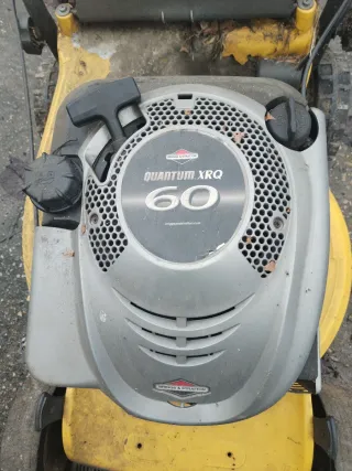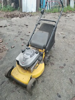 Cortacésped amarillo con motor Briggs & Stratton. - Ruedas delanteras y traseras. - Bolsa recolectora de césped. - Manillar plegable para fácil almacenamiento.