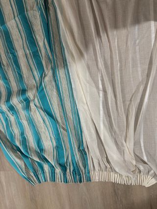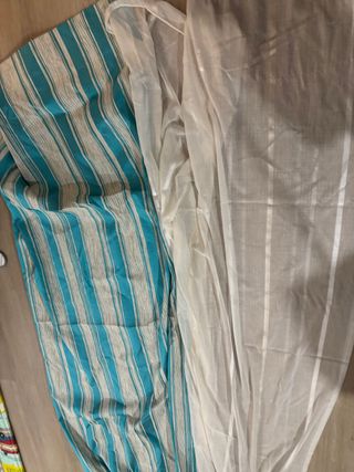 Cortinas de tela con un diseño de rayas verticales en tonos azules y blancos. Son ideales para añadir un toque de color y estilo a cualquier habitación. - Diseño de rayas verticales. - Combinación de colores azul y blanco.cortina mas visillo hechas a mano Dos patas de 1 metro por unos 2 de largo