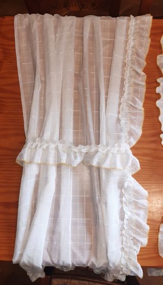 Cortina para ventana de cocina, con sobre cortina de 34 cm de largo. Hechas a mano. Con calado y dibujo. Tiene poco tiempo de uso. Es apropiada para una barra y posibilidad de coser cinta de cortina para riel