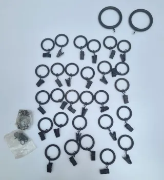 Pack de 10 anillas para cortinas de Ikea, modelo SYRLIG. Tengo dos paquetes ambos por 5€. - Diámetro de 38 mm. - Incluyen clip y gancho. - Color negro.