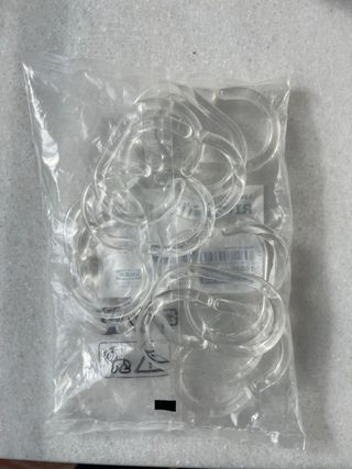 Juego de anillas y tapones para cortinas de la marca IKEA, modelo SYRLIG. Son de color negro y miden 25 mm. - Incluye 2 tapones Raffig. - Se incluyen 10 anillas y varios clips para sujetar las cortinas. valorado en 8€ en IKEA.