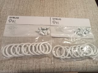 Se venden 4 paquetes de anillas para cortinas SYRLIG de IKEA En color blanco. Mas dos paquetes de 10 clips. Cada paquete contiene: - 10 anillas de 5 cm de diametro. - 10 clips -10 ganchos Permite colgar las cortinas de diversas formas. Sin estrenar. En el ambalaje original. - El precio de cada paquete del kit de anillas, clips y ganchos es de 3€ - El precio de cada paquete de clips es de 1€