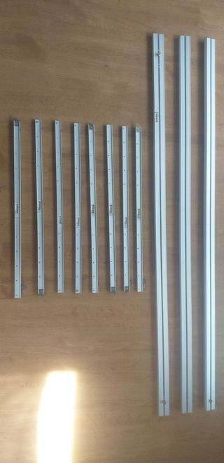 Tres juegos de rieles para panel japonés Ikea, en color metalizado. Dos juegos están preparados para soportar 3 paneles y uno para 2 paneles Incluye las piezas de fijación a la pared/techo y todos los soportes/accesorios necesarios El precio es por juego