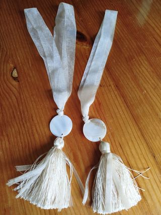 Preciosos alzapaños de Zara Home, ideales para dar un toque elegante a cualquier ventana. Son dos unidades. - Confeccionados con materiales delicados. - Diseño con borlas y piezas de nácar. - Color beige y blanco.