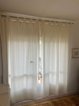 Vendo pack: - barra doble cortina ikea 55,91€ - Pack de dos cortinas de lino blanco zara home 80€ - Pack de dos cortinas semiopacas ikea color beig 49,99€ Valor total en tiendas = 185,9€ Lo vendo todo por: 120€ (Las cortinas las vendo lavadas y planchadas) Todo en perfecto estado, pero nos mudamos y las medidas no me sirven…. En la foto de pantalla de la web de Ikea vereis las medidas exactas de la barra. Las medidas de ambas cortinas son estas: 145 de ancho y 245 de largo Ya que corté y cosí a maquina el largo para que no tocaran el suelo.