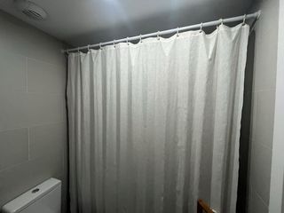 Cortina de baño de tela blanca con borde verde. - Diseño liso y elegante. - Fácil de colgar. Incluye la barra para su sujeción. Actualmente esta en una pared de 1’7 metros.