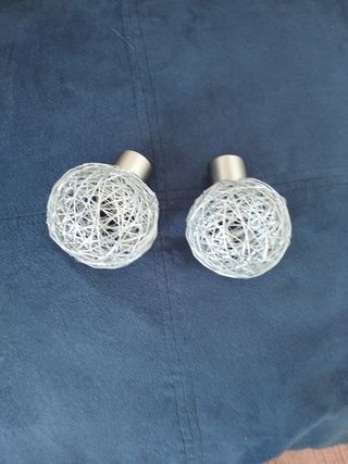 Dos terminales decorativos para barra de cortina con un diseño esférico y entrelazado. - Diseño de esfera de alambre. - Acabado plateado.