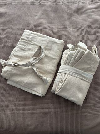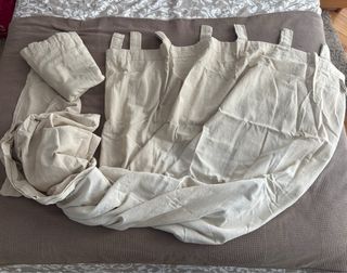 Elegantes cortinas de lino en color natural (blanco roto), perfectas para dar un toque de calidez a tu hogar. Sistema de lazos. Se cuelgan con un sencillo lazo en la barra, no es necesario ningún sistema adicional. Perfecto estado. Se trata de un conjunto de 8 cortinas para cubrir 4 ventanas estándar. El precio se refiere a las 8 cortinas. Se puede vender el pack completo o por pares (25 euros el par, 100 euros las 8 cortinas).