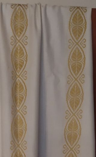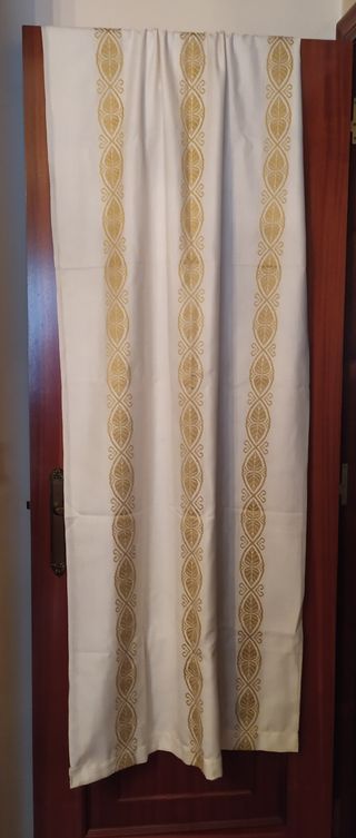 NO ENVÍOS.-NUEVAS_Color crudo-Cortinas de tela- Diseño con franjas verticales de hojas entrelazadas en oro viejo.Algunas piezas están bastilladas. Piezas: - 1 de 1,50 x 2,30 --1 de 62 x 3,30 --2 de 75 x 2,52 --2 s 42,5 x 3,32