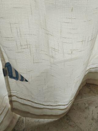 Cortina blanca y con hojas azules de decoración, medidas 150cm x 260cm. 100% poliéster y ecológicas. Están recién compradas, como nuevas. Se aceptan envíos.