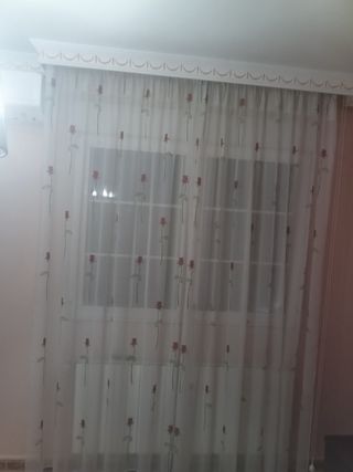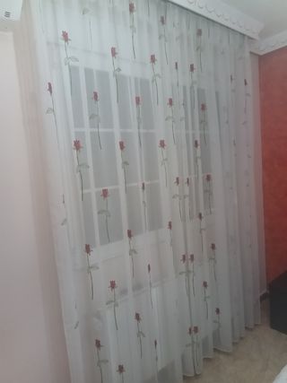 Bonitas cortinas translúcidas para dar un toque de elegancia a tu hogar. Son de tela y tienen un diseño delicado con rosas rojas sobre fondo blanco.para un hueco de 2 mt - Ideales para ventanas de tamaño mediano. - Están en muy buen estado.