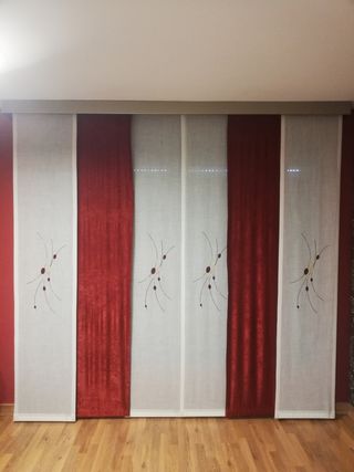 Conjunto de tres paneles japoneses en un tono morado. Incluye dos cojines a juego. Medidas ancho barra 172 cm y altura de las telas 250. Segundo juego de cortinas tipo panel japonés de marca destiny, en tonos grises. Medidas: ancho barra 157 y largo de cortinas 250. Precio de ambas 60 euros. Por separado 40 euros cada una.