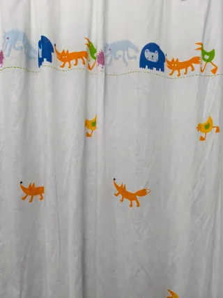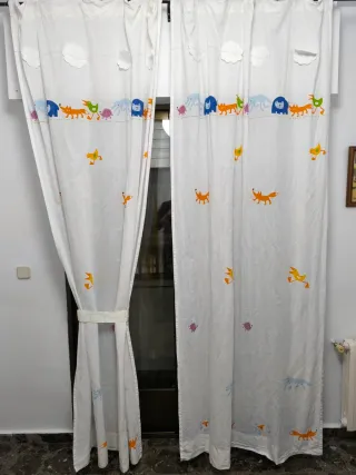 2 cortinas (118 x 245 cm) con un divertido estampado de animales y nubes. En buen estado. Incluyen alzapaños a juego.