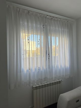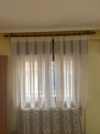 Conjunto de cortinas con sus accesorios. - Cortinas de tela blanca. - Varillas de madera. - Soportes y anillas incluidos. Para ventanas de 1,50 de ancho