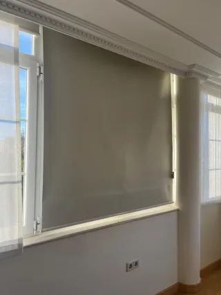 Se venden 4 estores opacos enrollables de color beige, medidas 150x165 y 190x165, junto al soporte de techo y mecanismo. Opción de vender por separado.