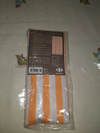 Cortina de baño a rayas naranjas y blancas, sin estrenar. - Medidas: 135 x 180 cm. - Material: PVC.