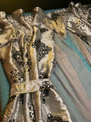 Cortina plateada con visillo gris claro a juego, todo en una sola pieza, se cuelga con velcro, aunque se puede adaptar a otro tipo de sujeción. Lleva dos tiras a juego para mantener las cortinas abiertas. Falta tomar las medidas, pero es 2m de ancho x algo más de 2m de alto, aprox. Lo que se ve en las fotos, no dude en preguntar. Hago descuento por más de tres artículos. ⚠️estoy enferma, y a veces no me da tiempo a enviar el paquete en el plazo⚠️ ⚠️No trabajo con correos⚠️ Recogida en mano solo en Alcantarilla o El Campello.