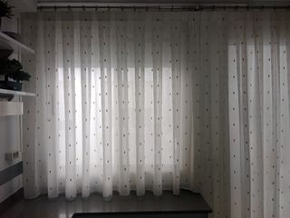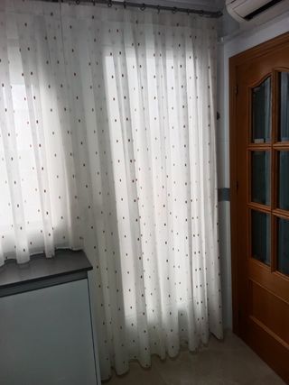 Dos cortinas de cocina, puesta en ventana y puerta de lavadero, con barra metálica, se sujetan mediante anillas. Medidas cortina ventana 1,30 mtrs plegada Medidas cortina puerta 1mtr plegada y 2,20 largo Largo barra 2,5 mtr *Se escuchan ofertas NO absurdas*