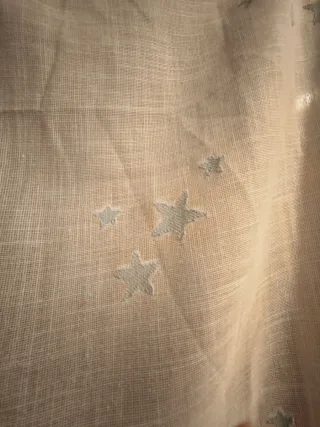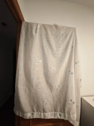 Cortinas de tela con un diseño de estrellas, ideales para una habitación infantil. Son ligeras y dejan pasar la luz. - Diseño de estrellas en tonos azules y blancos. - Tejido de tela. - Como nuevas - 140x150 cm