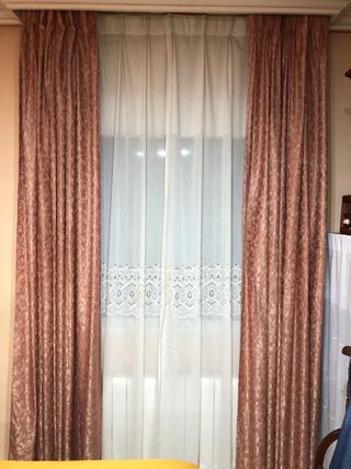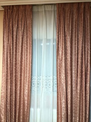 Cortinas dos hojas color rosa a salmonado y dos blanca , son de pinzas !