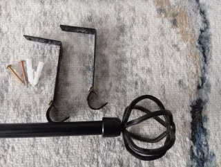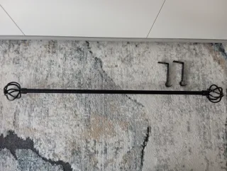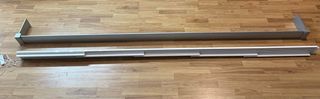 Dos juegos de barras para cortinas compuesto por: - Dos barras extensibles desde 110 a 200 cm con terminales redondos. - Una barra fija de 150 y otra de 160 con terminales de tapón, se pueden cortar a otra medida menor. - Cuatro anclajes de pared. -47 anillas. Venta por separado, cada juego a 15 euros.