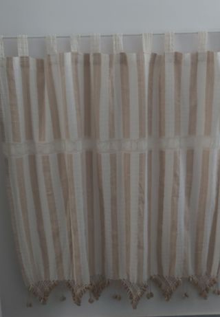 Cortina tipo store con un diseño moderno y elegante. Ideal para cualquier estancia del hogar, deja pasar muy bien la luz. - Tejido de alta calidad. - Combinación de colores blanco y beige. Tiene velcro en la parte superior y anillas plásticas a ambos lados para anclar el mecanismo. En la parte inferior se puede introducir una barra que haga como pesa. Mide 126 de ancho y 138 de largo.