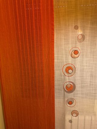 Juego de cortinas tipo tela japonesa con un diseño moderno. - Combinación de colores naranja y blanco. - Tejido ligero y traslúcido.