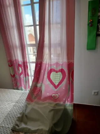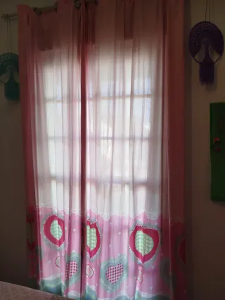 Cortinas de tela con un bonito diseño para habitación infantil. Incluyen barra de madera. - Estampado de corazones. - Tonos rosas y verdes. 2 cortinas de 1,35 x 2,50 Barra madera 1,50 con soportes y remates en los extremos