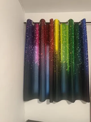 Preciosa cortina a rayas rojas, perfecta para dar un toque de color a tu hogar. Está sin estrenar y lista para colgar. Las medidas de cada hoja son 234 cm de ancho x 273 cm de largo. La bastilla no está hecha para adaptarla a la medida necesitada. - Dos paneles incluidos. - Diseño de rayas multicolor. - Tejido de calidad.