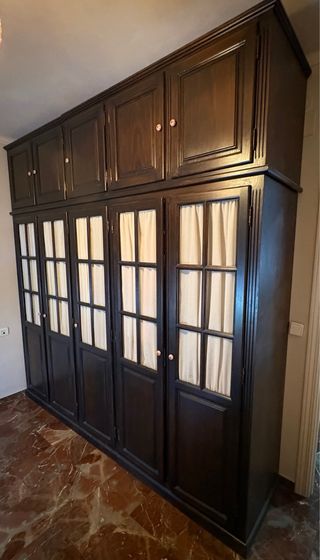 Armario de madera oscuro con un diseño clásico y elegante. - Puertas con divisiones de tela - Tiradores redondos. - Acabado en madera oscura. Medidas orientativas, ya que no se ha medido aun