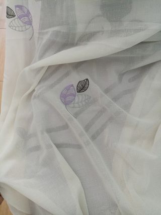 Cortinas color hueso con detalles de hojas en morado, gris y negro. Preparadas para poner en barra y con la opción de poner ganchitos. Son 2 cortinas, harían un total de 2'50 de ancho.