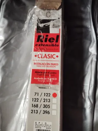 Barra de cortina extensible Riel Clasic, ideal para instalación en pared. Acabado en blanco. - Modelo: Clasic - Tipo: Extensible - Instalación: Pared - Acabado: Blanco - Medidas disponibles: 71/122
