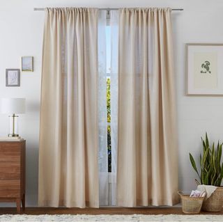 Cortinas de lino en tono beige, listas para colgar. Dejan pasar la luz pero difuminan. Ideal para dar privacidad sin renunciar a tener luminosidad. Precio original: 58€ - Medidas: 140 cm de ancho x 300 cm de largo. - Incorporan anillas metálicas para una fácil instalación. - Tejido con textura natural.