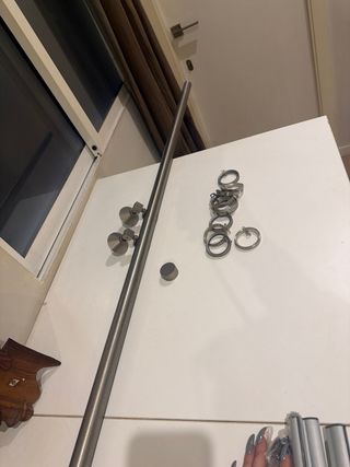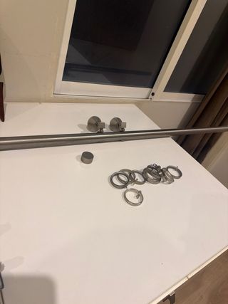 Barra para cortina de metal. - Incluye soportes. - Incluye anillas. -Incluye ganchos