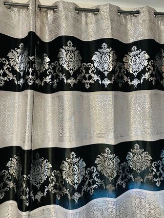 Elegantes cortinas con un diseño distintivo. - Patrón damasco en negro y plateado. - Acabado brillante. - Borde superior con ojales para colgar.