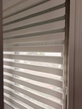 Estor enrollable de diseño Noche y Día en color blanco con franjas grises. Mide 2,09 metros de ancho por 2,25m de alto. Usado menos de un año. Vendo por reformas. Estado impoluto. - Combina franjas opacas y translúcidas. - Mecanismo de cadena para subir y bajar. - Ideal para controlar la luz y la privacidad.