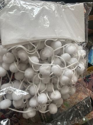 Cortina decorativa con copos de nieve, ideal para crear un ambiente festivo. - Diseño con pompones blancos. - Cuelga fácilmente en ventanas o puertas.