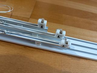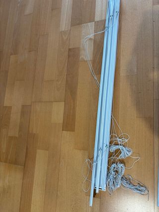 Conjunto de rieles para cortinas o paneles, listos para instalar. - Rieles de metal y plástico. - Color blanco - 3 carriles - 3 unidades, 2 de 3,2 metros y 1 de 2,45 metros 20 € cada uno de 3,2 m. 15 € el de 2,45 m.