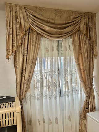 Elegantes cortinas en tono dorado con un visillo a juego. Una es de 1,40m y la otra de 2,20m