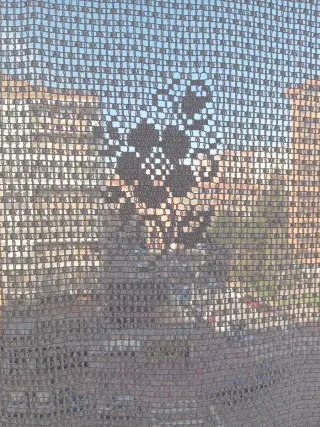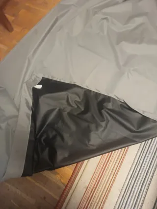 Cortina mosquitera con un diseño moderno. Tengo dos - Fabricada con tela y plástico. - Combina tonos grises y blancos.
