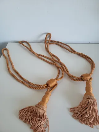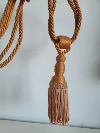Dos cuerdas decorativas para cortinas con borlas. - Color marrón dorado. - Material de poliéster. - Acabado de cuerda rígida y borla de cuerditas sueltas