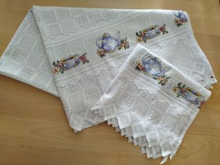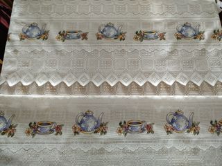 Cortina de cocina para puerta y ventana con bandeau. En encaje blanco y dibujo al pie. Perfecto estado
