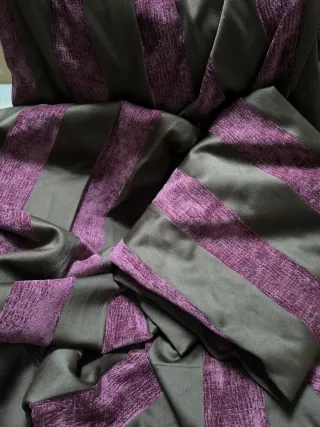 Elegantes cortinas con un diseño de rayas verticales que combinan texturas y colores. - Diseño de rayas verticales. - Combinación de algodón y chenilla aplanada. - Tonos grises verfosos y burdeos berenjena.