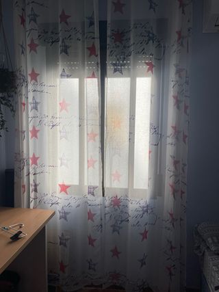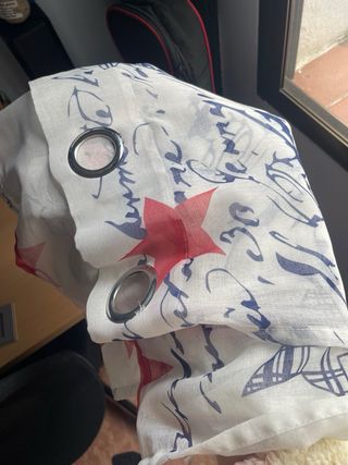 Cortinas con diseño de estrellas y texto rojo y azul.