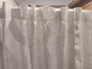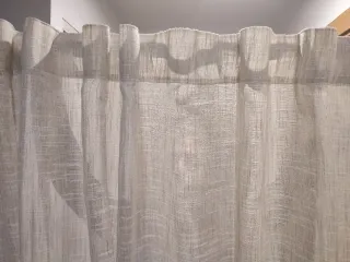 Cortina de tela con un diseño sutil y elegante. - Confeccionada con tejido de lino. - Tonos beige y blanco que combinan fácilmente.